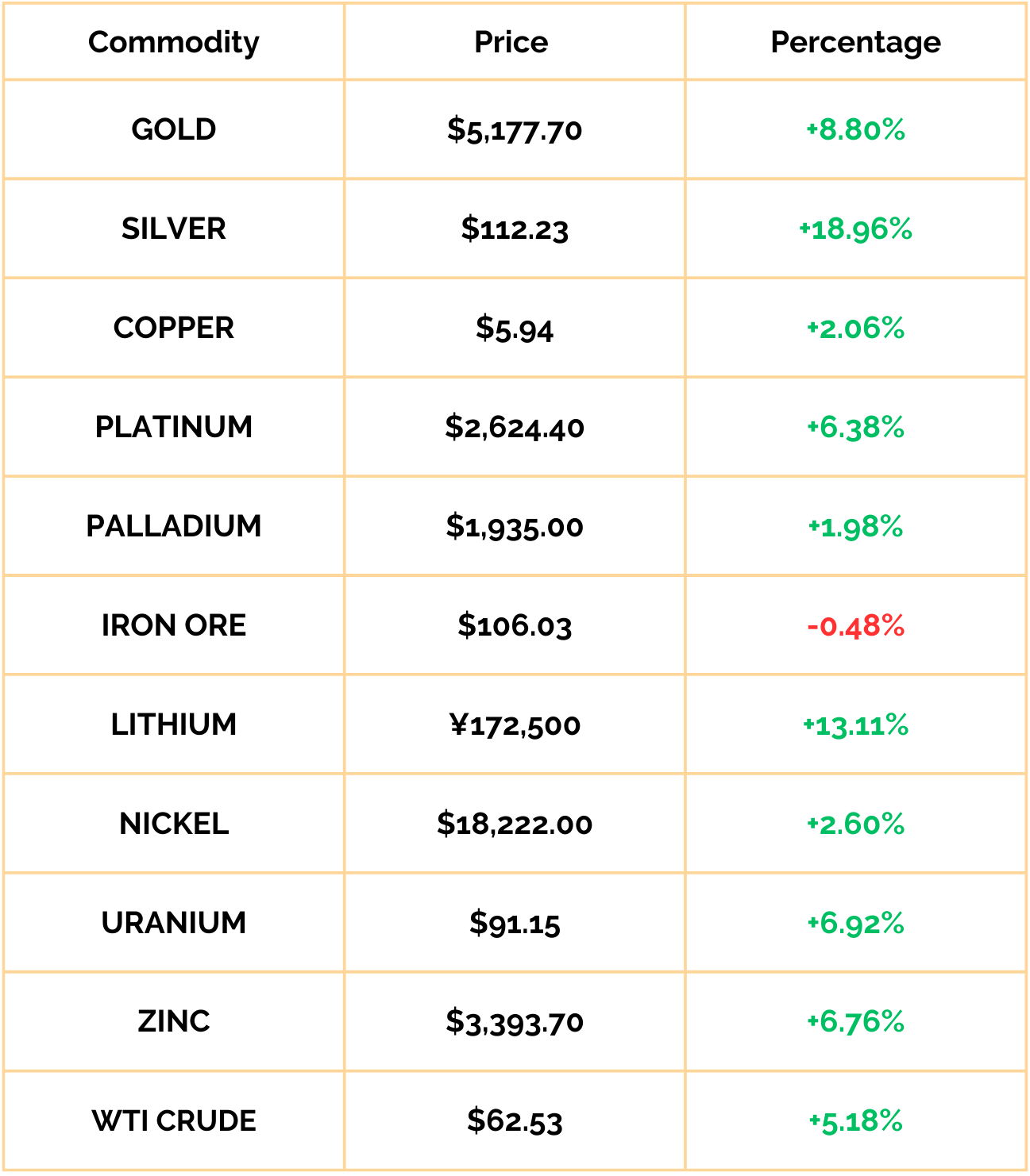 **For our chart above we are taking prices from Tuesday 4pm EST to Tuesday 4pm EST, so not the typical week of Monday through Friday. This week however, we have done December 16th 4pm EST to January 13th 4pm EST.